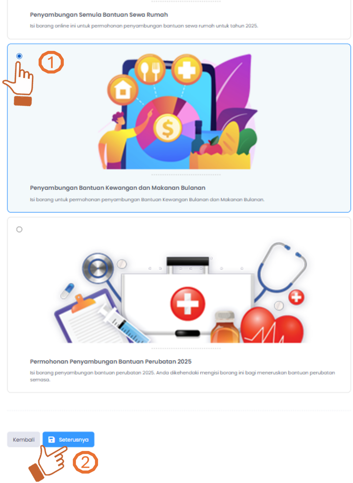 Tick pada penyambungan Bantuan Kewangan dan Makanan Bulanan kemudian skrol kebawah dan klik seterusnya.
