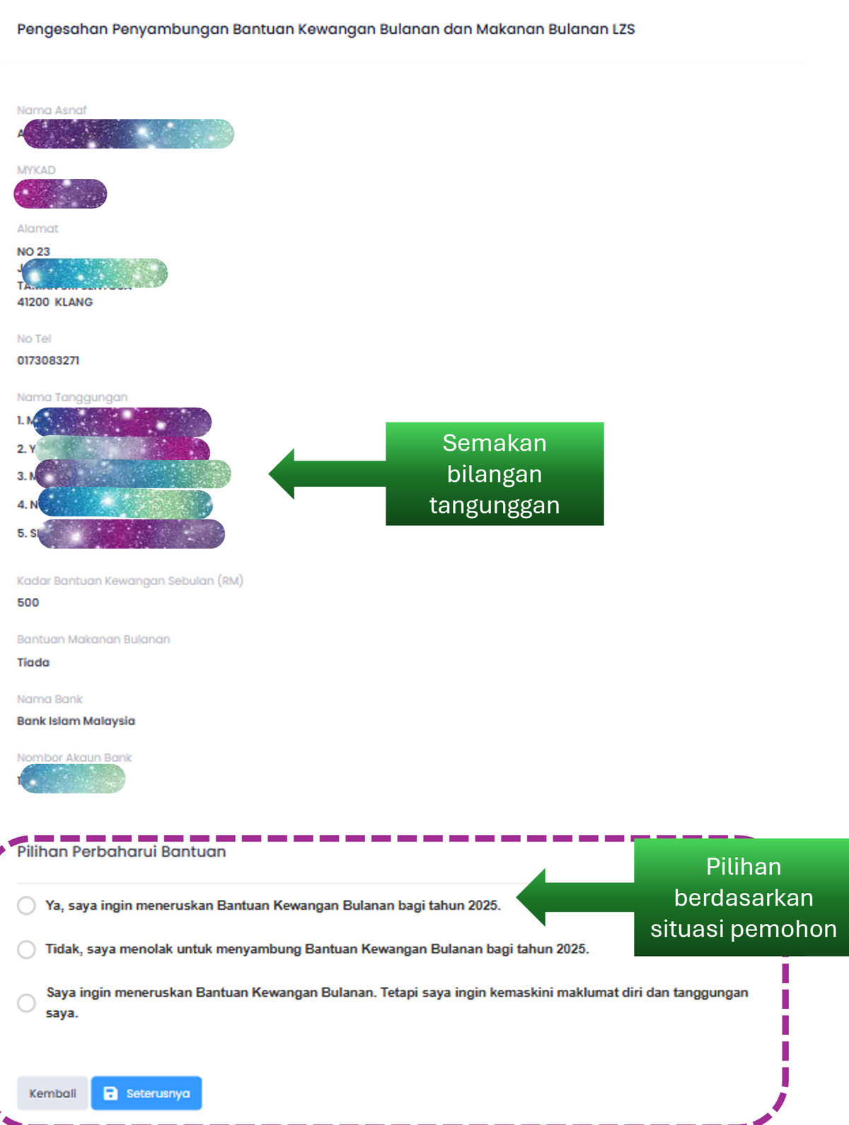 Proses PENYAMBUNGAN bantuan bulanan bagi mereka yang telah berdaftar/mempunyai rekod bantuan aktif sehingga Disember 2024 dengan LZS.