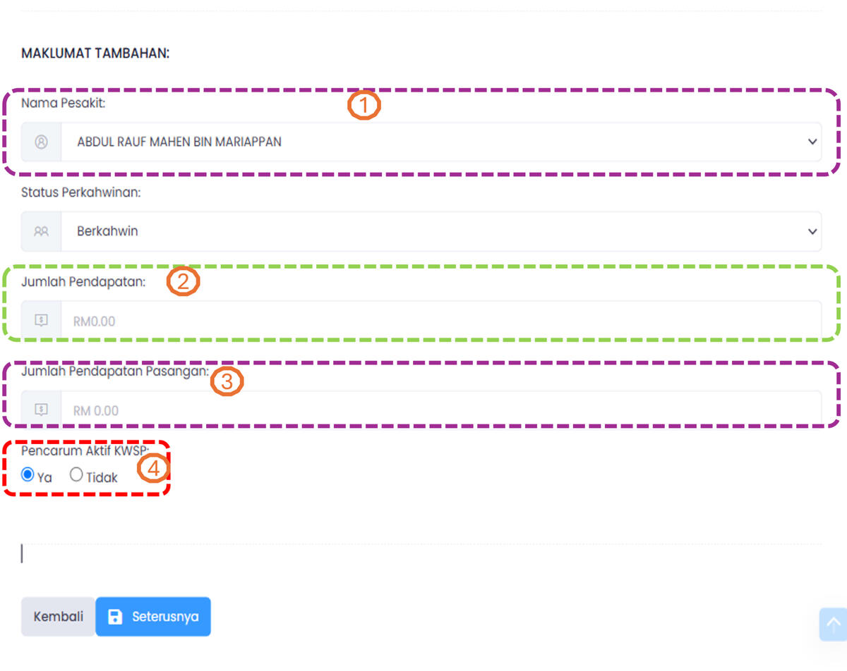 Sila isi maklumat tambahan iaitu nama pesakit , status perkahwinan, pendapatan, pendapatan pasangan dan pada item pencarum aktif kwsp sila tandakan yang berkaitan