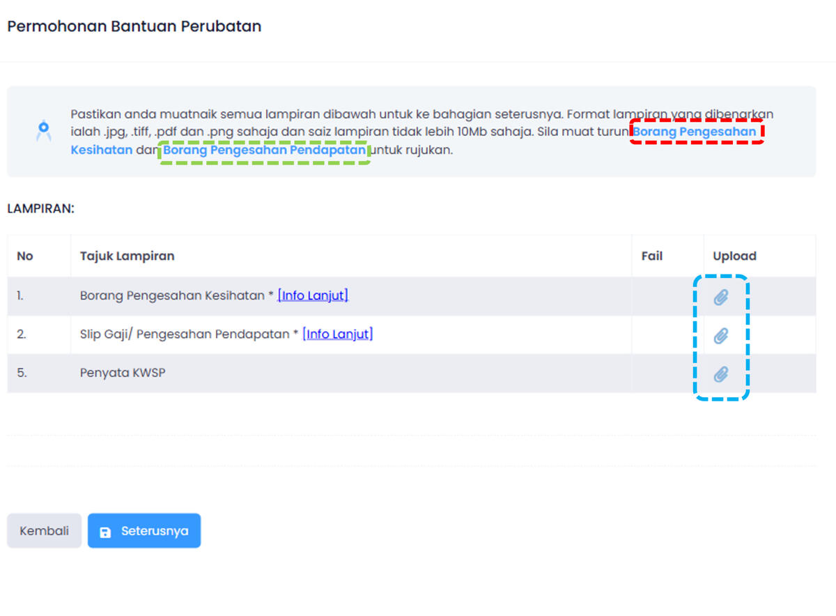 Bagi dokumen yang dimuat naik sila pastikan saiz file tidak melebihi 10mb